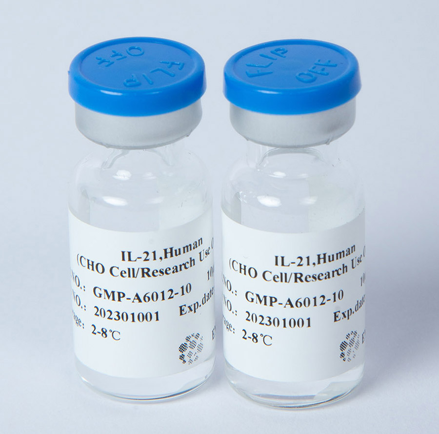 The recombinant human IL- 21 mature protein contains 131 amino acids and exhibits biological activity in monomeric form. It can promote the proliferation and differentiation of bone marrow NK cells, synergistically stimulate the proliferation of B cells with anti-CD40 antibodies and synergistically stimulate the proliferation of T cells with anti-CD3 antibodies.